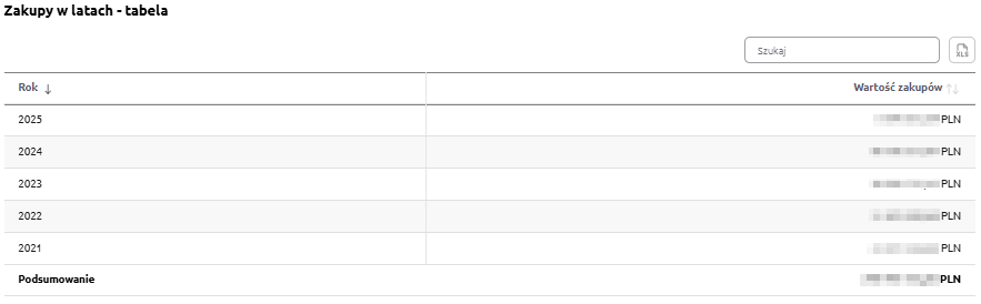 “Purchases over the years – table” – the table presents the value of purchases for each year, allowing users to review how purchasing costs have changed over time and what the total amount was over a longer period.