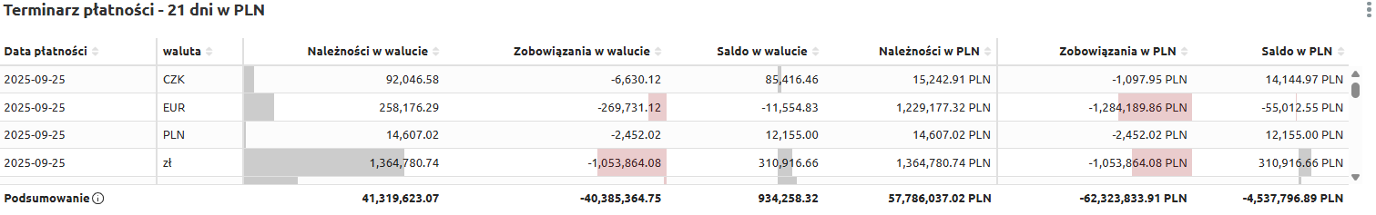 “Payment schedule – 21 days in PLN – table” – this summary presents a forecast of receivables and liabilities for the next 21 days, broken down by currencies.