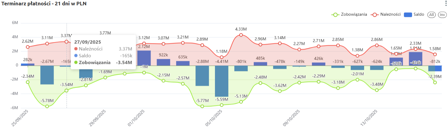 “Payment schedule – 21 days in PLN” – the chart presents a forecast of financial flows for the next 21 days. It allows users to assess how the company’s payment schedule is shaping up and on which days a cash surplus or shortage may occur.