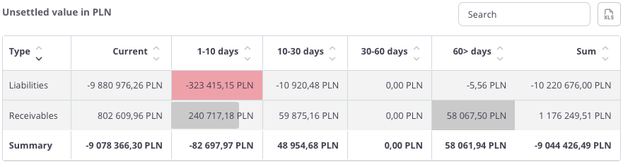“Unsettled value in PLN – table” – this summary presents outstanding receivables and liabilities broken down by overdue periods. For each category, the following values are displayed: