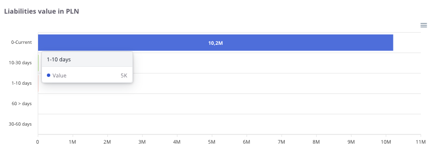 “Liabilities value in PLN” – the chart presents the company’s liabilities broken down by overdue periods. It allows users to check which portion of liabilities is current and which requires immediate attention.
