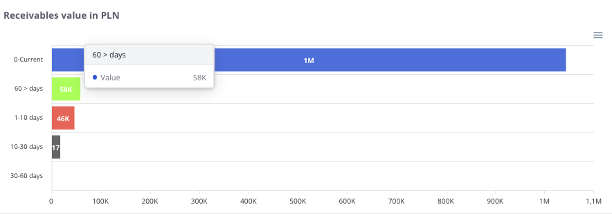 “Receivables value in PLN” – the chart presents the company’s receivables broken down by overdue periods. It allows users to check which portion of receivables is current and which is already past due.