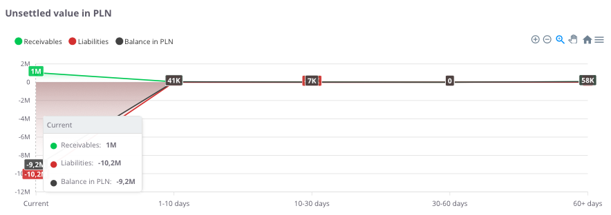 “Unsettled value in PLN” – the chart presents outstanding settlements over time, broken down by overdue periods. This makes it possible to see how the structure of receivables and liabilities changes across different time intervals.