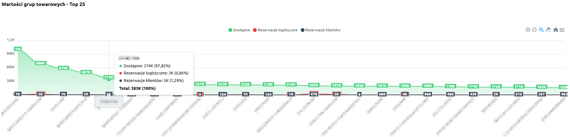 Thanks to this, the chart allows users to quickly assess which product groups generate the highest warehouse value, as well as determine what portion of the stock is available versus reserved.